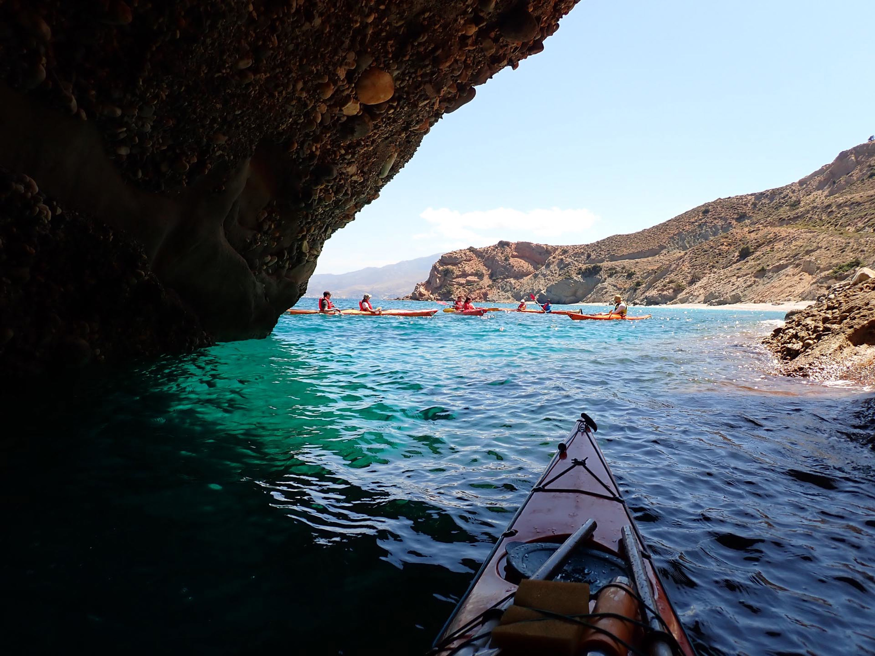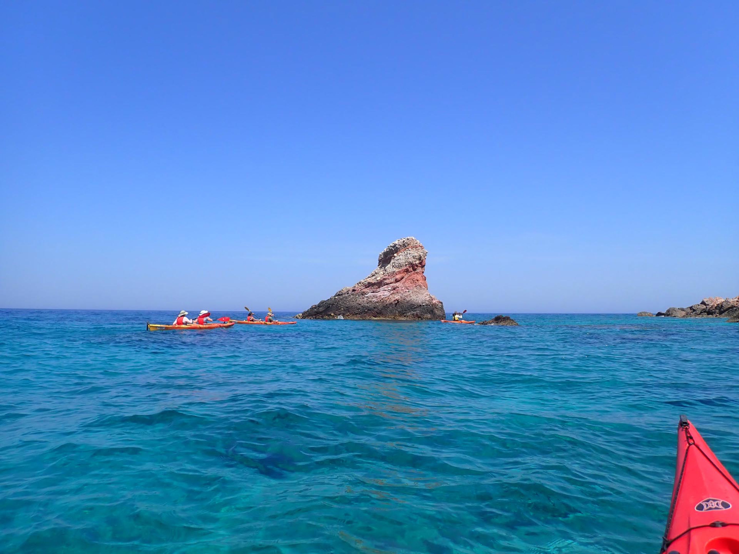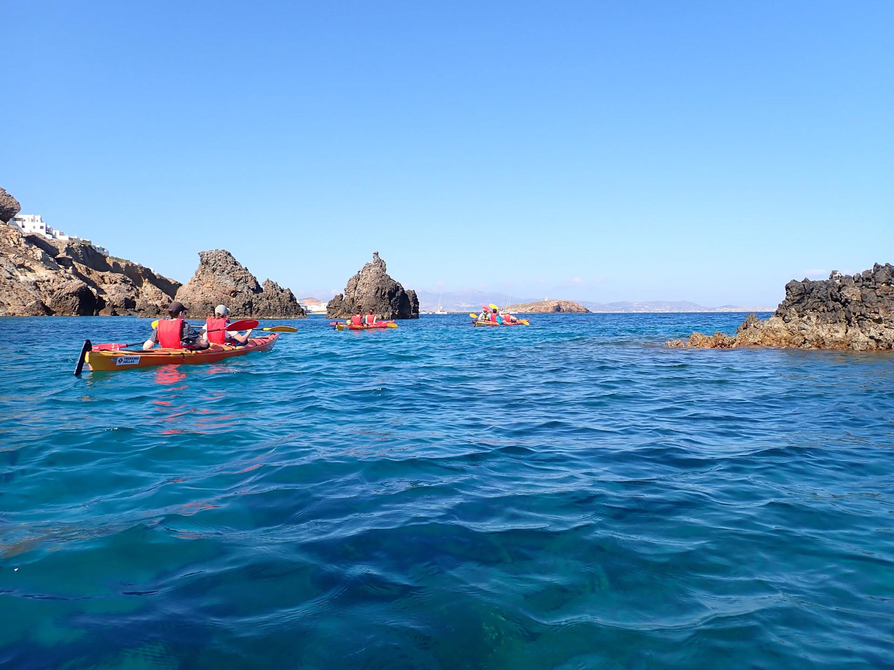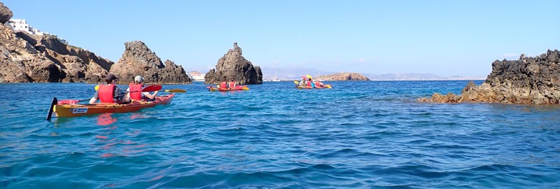 Κωπηλατώντας στα καταγάλανα, κρυστάλλινα νερά, θα ανακαλύψουμε κρυμμένους όρμους, ήσυχες παραλίες και εντυπωσιακά βράχια. Καθ’ όλη τη διάρκεια της διαδρομής, απολαμβάνουμε μοναδική θέα προς τις κοντινές βόρειες Κυκλάδες.