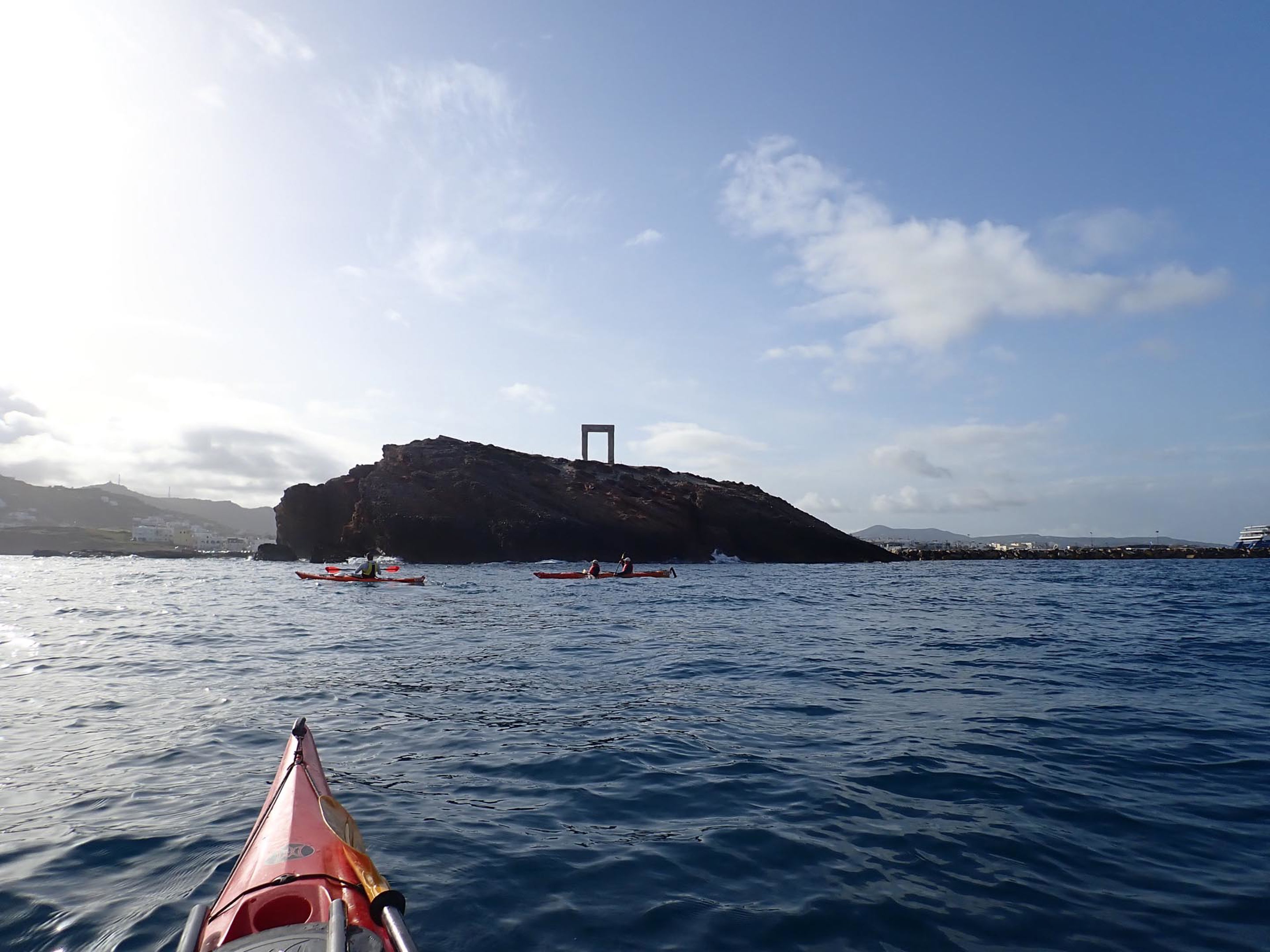 Στη συνέχεια, ξεκινά μια συναρπαστική διαδρομή sea kayaking, 9 χιλιομέτρων, κατά μήκος της εντυπωσιακής δυτικής ακτής της Νάξου. Καθώς απομακρυνόμαστε από τον προστατευμένο όρμο, θα δούμε την εντυπωσιακή Πορτάρα, το εμβληματικό μνημείο του 6ου αιώνα και σύμβολο του νησιού, ενώ παράλληλα θα μάθουμε τους μύθους και τις ιστορίες που τη συνοδεύουν. Θα συνεχίσουμε περνώντας από την περιοχή της Γκρόττας, με τα χαρακτηριστικά λευκά και μπλε σπίτια χτισμένα πάνω στους βράχους, θα ταξιδέψουμε πίσω στο χρόνο και θα μάθουμε για τη βενετσιάνικη περίοδο και το ιστορικό κάστρο της Νάξου.