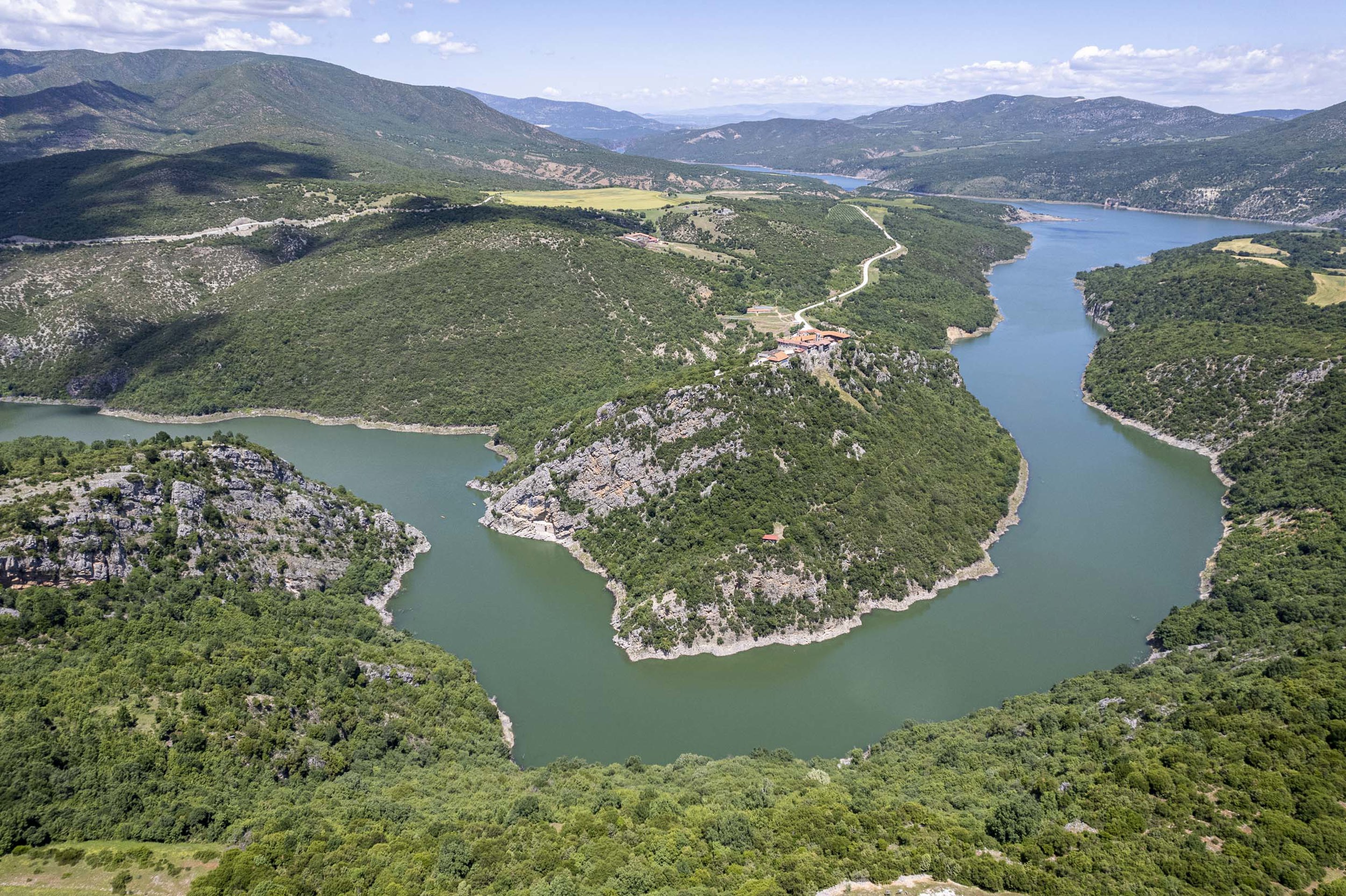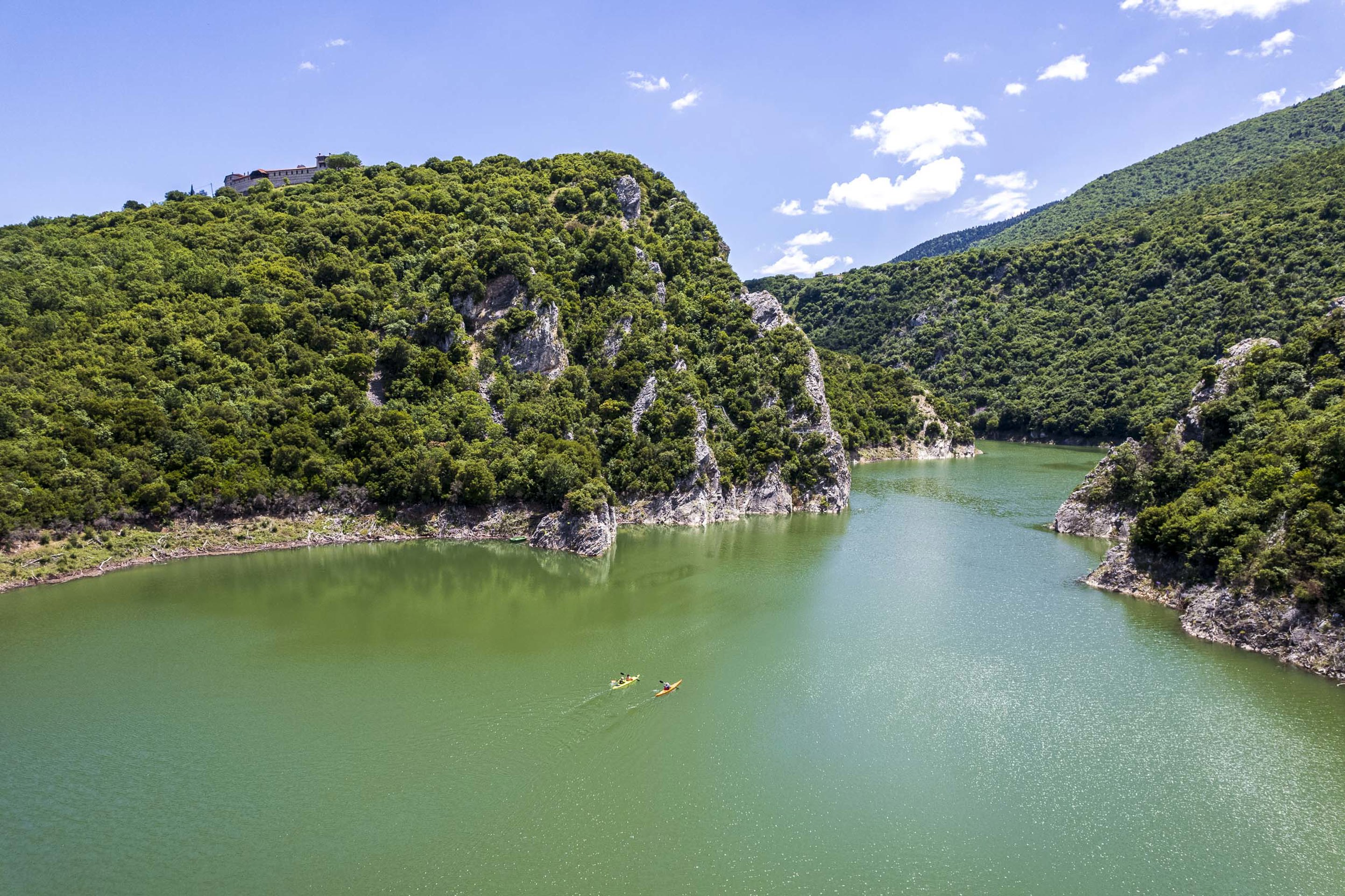 Lake Ilariona is one of the newest artificial lakes in the country, formed after the construction of the hydroelectric dam. It is an important wetland for many species of birds and animals, while the green slopes around it create a sense of peace. Paddling through its narrow passages resembles a fjord, with steep cliffs and rich vegetation reflected in the calm waters.